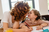 opiekuńczy matka przytulanie i patrząc na córka odizolowany na beżowy
