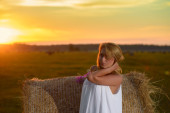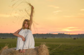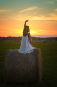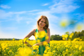 szczęśliwy womanin żółta sukienka w złotej pszenicy