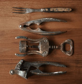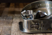 Zdjęcie "Garnek gliniany, drewniany sito i metalowe urządzenie do soków na białej ścianie. Stare akcesoria w domu. Lekkie tło." może być wykorzystywane do celów osobistych i komercyjnych zgodnie z warunkami zakupionej licencji Royalty-free. Obraz jest dostępny do pobrania w jakości wysokiej rozdzielczości do 5760x3840.
