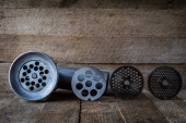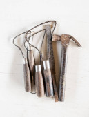 Garnek gliniany, drewniany sito i metalowe urządzenie do soków na białej ścianie. Stare akcesoria w domu. Lekkie tło.