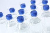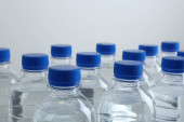 Plastikowe butelki z czystą wodą na białym tle, zbliżenie
