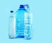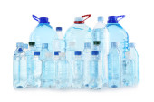 Plastikowe butelki z czystą wodą na białym tle, zbliżenie