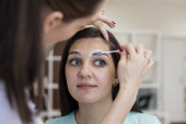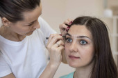 Kolorowanki brwi z henną z bliska. Korekta i farbowanie brwi. Stały makijaż. Mikroostrze
