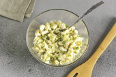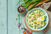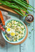 Sałatka wiosenna z jajkiem, zielonym groszkiem i zieloną cebulą w misce na rustykalnym stole.