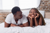Wesoła Afroamerykanka patrząca w kamerę obok chłopaka w domu, sztandar