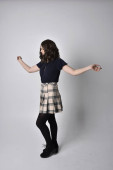 Portret pięknej brunetki w tartanowej spódnicy i bluzce. Pozycja stojąca na ziemi, na tle studia.