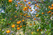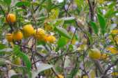 Drzewo z dojrzałymi żółtymi cytrynami na gałęziach wśród zielonych liści, zbierające plony na farmie latem, Grecja