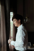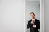 Szczęśliwy młody człowiek w eleganckim stroju casualwear patrząc na swoją żonę stojącą przed nim podczas rysowania ciemnych zasłon w pokoju hotelowym w godzinach wieczornych