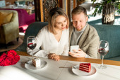 Szczęśliwy młody człowiek podając prezent na Walentynki swojej pięknej dziewczynie, siedząc przy stole i jedząc kolację.