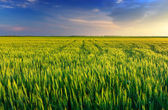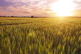 Złoty wschód słońca nad polem pszenicy.Ogromna chmura oświetlała żółto-pomarańczowe promienie słońca.