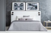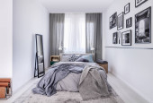 Nowoczesna i przestronna sypialnia z dużym i wygodnym łóżkiem, lustro na drzwiach szafy i sztuki