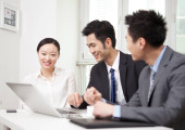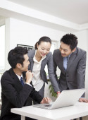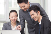 Grupa przedsiębiorców omawiająca pracę na komputerze
