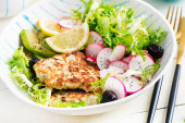 Dieta ketogenna. Talerz Buddy z hamburgerem z kurczaka, awokado, rzodkiewki i czarne oliwki. Detoks i zdrowa koncepcja. Keto jedzenie. Nad głową, widok z góry, płaski układ
