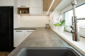 Zdjęcie "Wnętrze nowoczesnej kuchni z wbudowanymi urządzeniami" może być wykorzystywane do celów osobistych i komercyjnych zgodnie z warunkami zakupionej licencji Royalty-free. Obraz jest dostępny do pobrania w jakości wysokiej rozdzielczości do 5760x3840.