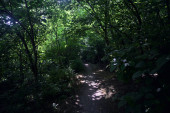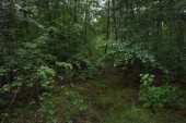 Zielone letnie leśne wzgórza. Wysokie mchy, światło słoneczne przez pnie drzew. Krajobraz wróżek. Ochrona środowiska w Niemczech