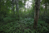 Kwitnące dzikie kwiaty na łące w pobliżu zielonych leśnych wzgórz. Brama wysokich mszalnych drzew, światło słoneczne przez pnie drzew. Krajobraz wróżek. Ochrona środowiska w Niemczech