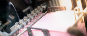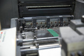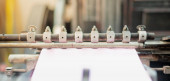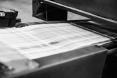 Efekt fotograficzny z maszyny drukarskiej zajmuje arkusza papieru w akcji w linii produkcyjnej druku, Stara maszyna z zardzewiałym dla małych koncepcji branży reklamowej.