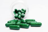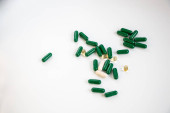 leczenie i zapobieganie chorobom, spirulina, kapsułki z zielonym proszkiem w tubce i wokół tuby