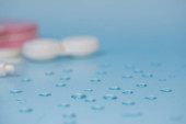 leczenie i zapobieganie chorobom, spirulina, kapsułki z zielonym proszkiem w tubce i w jej pobliżu, jedna tabletka w dłoni