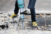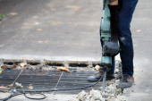 Mężczyzna pracownicy używają elektrycznego łamacza betonu do kopania i wiercenia betonu naprawa powierzchni podjazdu z młotem pneumatycznym na lokalnej drodze miejskiej, podczas chodnika, placu budowy.