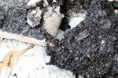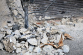 Mężczyzna pracownicy używają elektrycznego łamacza betonu do kopania i wiercenia betonu naprawa powierzchni podjazdu z młotem pneumatycznym na lokalnej drodze miejskiej, podczas chodnika, placu budowy.