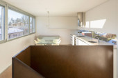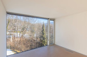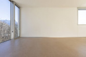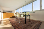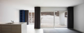 Panoramiczne wnętrze jadalni i kuchni. Nowoczesna przestrzeń.