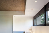 Wnętrze nowoczesnego mieszkania, po lewej stronie kuchnia, a po prawej stół jadalny.