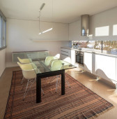 Wnętrze nowoczesnego mieszkania, widać kuchnię i stół jadalny. Jest słoneczny zimowy dzień..