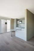 Zdjęcie "Wnętrze nowoczesnego mieszkania, widać kuchnię i stół jadalny. Jest słoneczny zimowy dzień.." może być wykorzystywane do celów osobistych i komercyjnych zgodnie z warunkami zakupionej licencji Royalty-free. Obraz jest dostępny do pobrania w jakości wysokiej rozdzielczości do 5760x3840.
