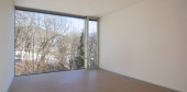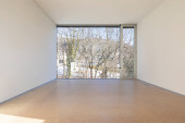 puste słoneczne wnętrze pokoju z białą ścianą malowaną, duże okno i nowoczesny drewniany parkiet podłogowy, nowe mieszkanie w budowie