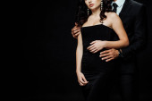 kolaż z namiętny brunetka kobieta w satynowy sukienka i młody mężczyzna w garnitur przytulanie na czarny