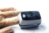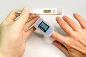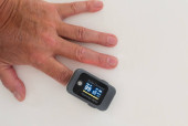 Pulsoksymetr na palcu dłoni mierzy ilość tlenu we krwi i puls..