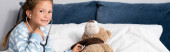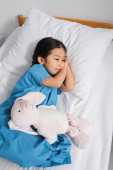widok z góry wesoły dziewczyna patrząc w aparat podczas leżenia w łóżku szpitalnym z misiem