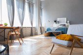 Drewniany stół z ładnymi dekoracjami i czarne krzesło w salonie ze ścianą okienną za białymi zasłonami, drewnianą podłogą i szarą sofą