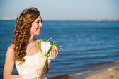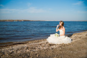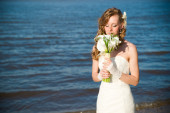 pięknej narzeczonej w białej sukni na wybrzeżu rzeki