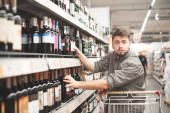 Zdjęcie "Niesamowity mężczyzna trzymający butelki wina w pobliżu koszyka na rozmytym pierwszym planie w supermarkecie " może być wykorzystywane do celów osobistych i komercyjnych zgodnie z warunkami zakupionej licencji Royalty-free. Obraz jest dostępny do pobrania w jakości wysokiej rozdzielczości do 5760x3840.