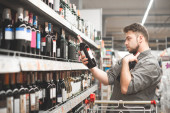 Collage of smiling man pointing at wine bottle near girlfriend and shopping cart in supermarket, banner