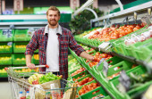 Uśmiechnięty mężczyzna patrzący na kamerę w pobliżu koszyka w supermarkecie