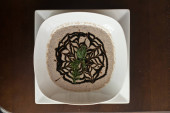 Różowy kawałek ciasta na czarnej tacy. Wysokiej jakości zdjęcie