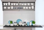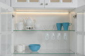 Otwarta szafka z różnymi czystymi naczyniami w kuchni