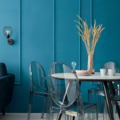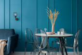 Zdjęcie "Mały salon ze szklaną ścianą, formowanie na ciemnej ścianie i eleganckie meble" może być wykorzystywane do celów osobistych i komercyjnych zgodnie z warunkami zakupionej licencji Royalty-free. Obraz jest dostępny do pobrania w jakości wysokiej rozdzielczości do 5760x3840.