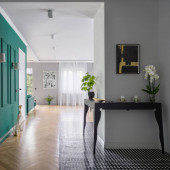 Mały salon ze szklaną ścianą, formowanie na ciemnej ścianie i eleganckie meble