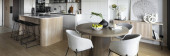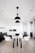 Apartament z białą kuchnią z przezroczystym stołem jadalnym z krzesłami otwartymi na salon z czarnym kwadratowym stołem kawowym