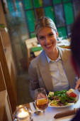 Młoda zakochana para je lunch w miłej atmosferze w restauracji. Para, miłość, restauracja, razem
