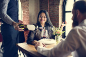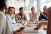 Młodzi biznesmeni cieszą się biznesowym lunchem w miłej atmosferze w restauracji. Biznes, restauracja, obiad