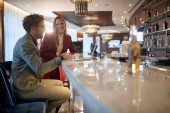 Młodzi ludzie jedzą lunch w miłej atmosferze w restauracji. Biznes, restauracja, obiad