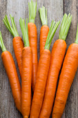 Świeże marchewki kilka na rustykalnym drewnianym tle.