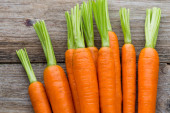 Świeże marchewki kilka na rustykalnym drewnianym tle.