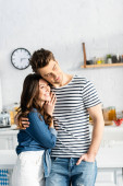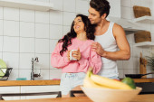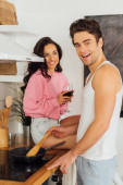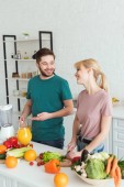 szczęśliwy mężczyzna uśmiechnięty w pobliżu pomidorów wiśniowych i kobieta na rozmytym tle