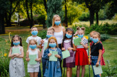 Zdjęcie "Klasa zamaskowanych dzieci szkolnych jest zaangażowana w szkolenie na świeżym powietrzu podczas epidemii. Powrót do szkoły, nauka podczas pandemii" może być wykorzystywane do celów osobistych i komercyjnych zgodnie z warunkami zakupionej licencji Royalty-free. Obraz jest dostępny do pobrania w jakości wysokiej rozdzielczości do 5760x3840.